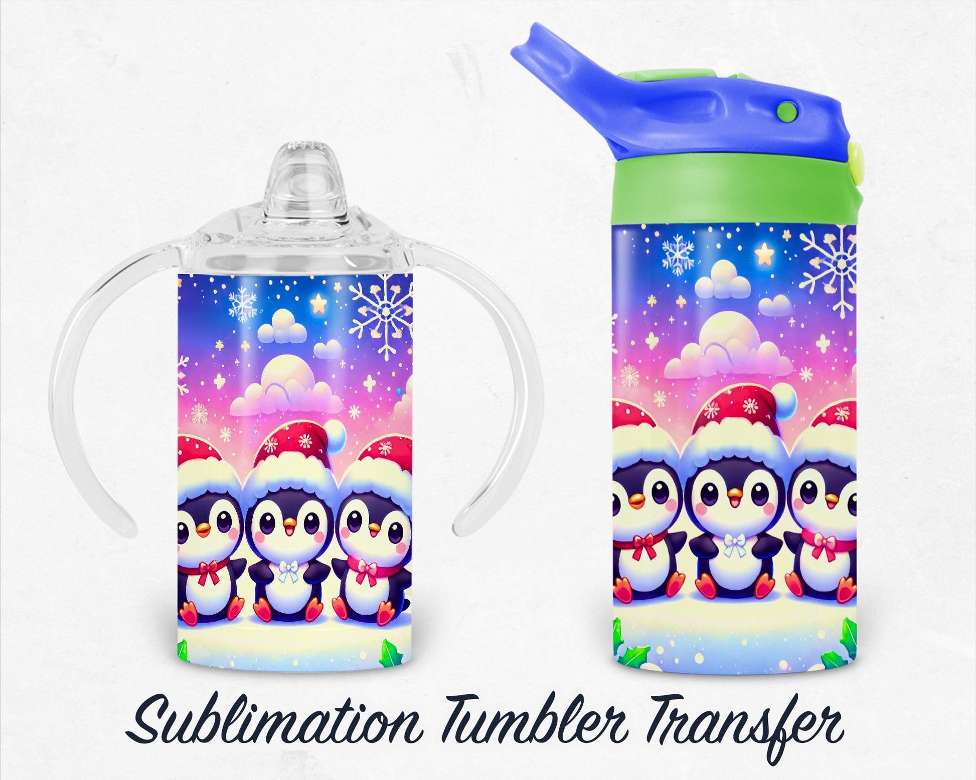 Christmas Penguins - Kids 12 oz Sippy Sublimation Tumbler Transfer - Ready To press Heat Transfers SHIPS NEXT DAY
