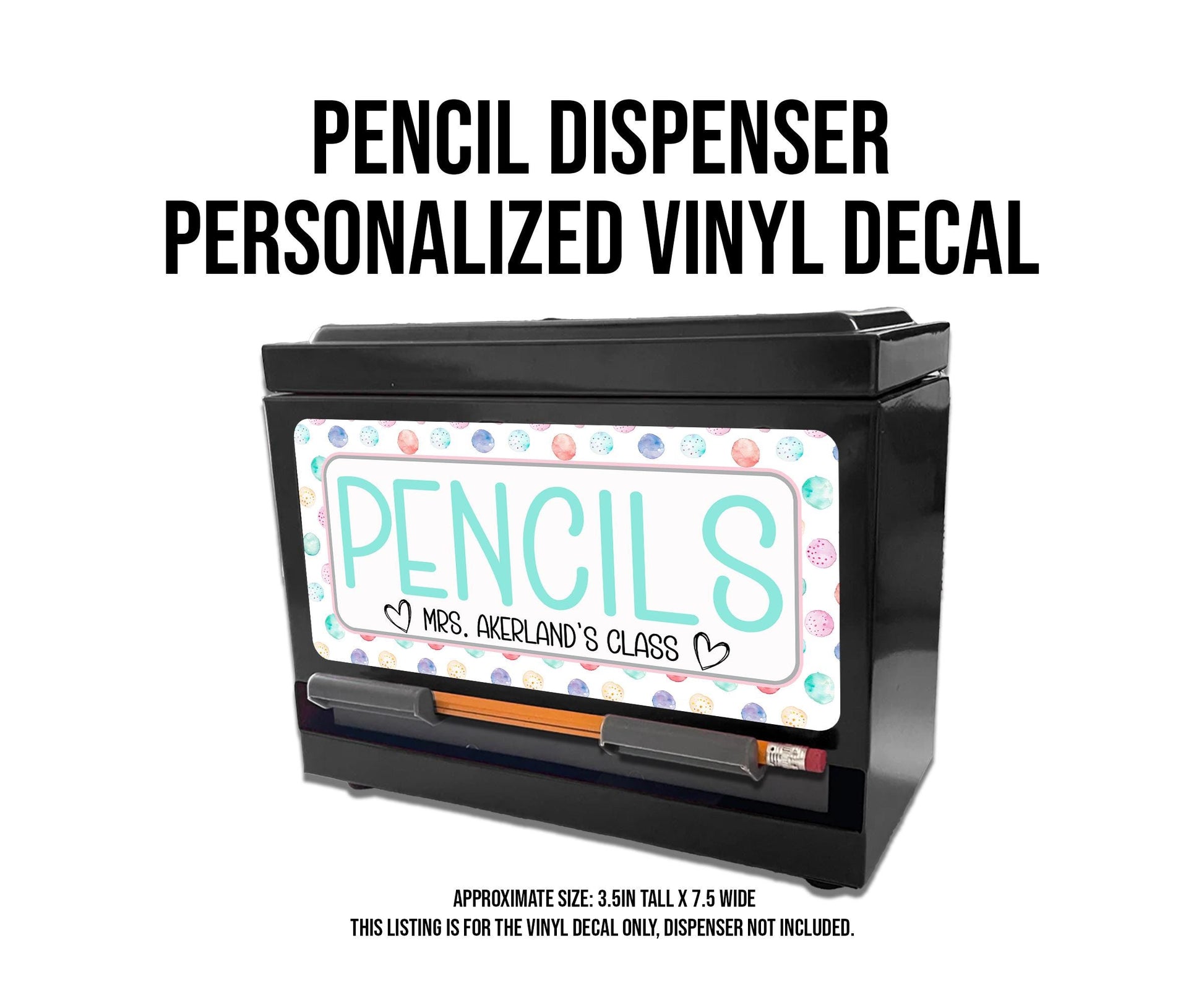 Personalized Vinyl Decal for Pencil Dispensers. Each decal will measure approximately 3.5 inches tall and 7.5 inches wide. Decal can be personalized with a name, room number etc. The word PENCILS can not be edited.