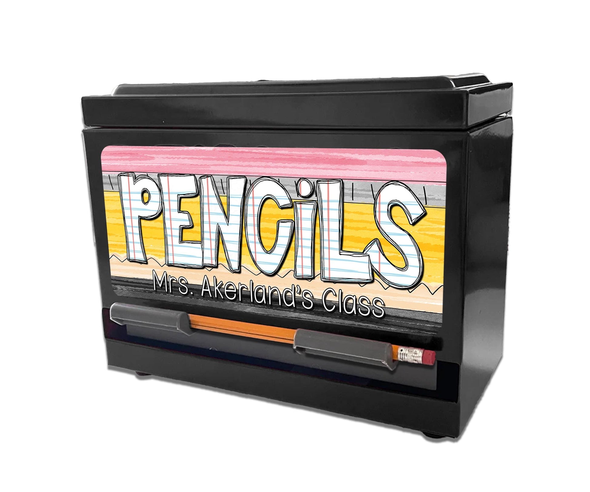 Personalized Vinyl Decal for Pencil Dispensers. Each decal will measure approximately 3.5 inches tall and 7.5 inches wide. Decal can be personalized with a name, room number etc. The word PENCILS can not be edited.