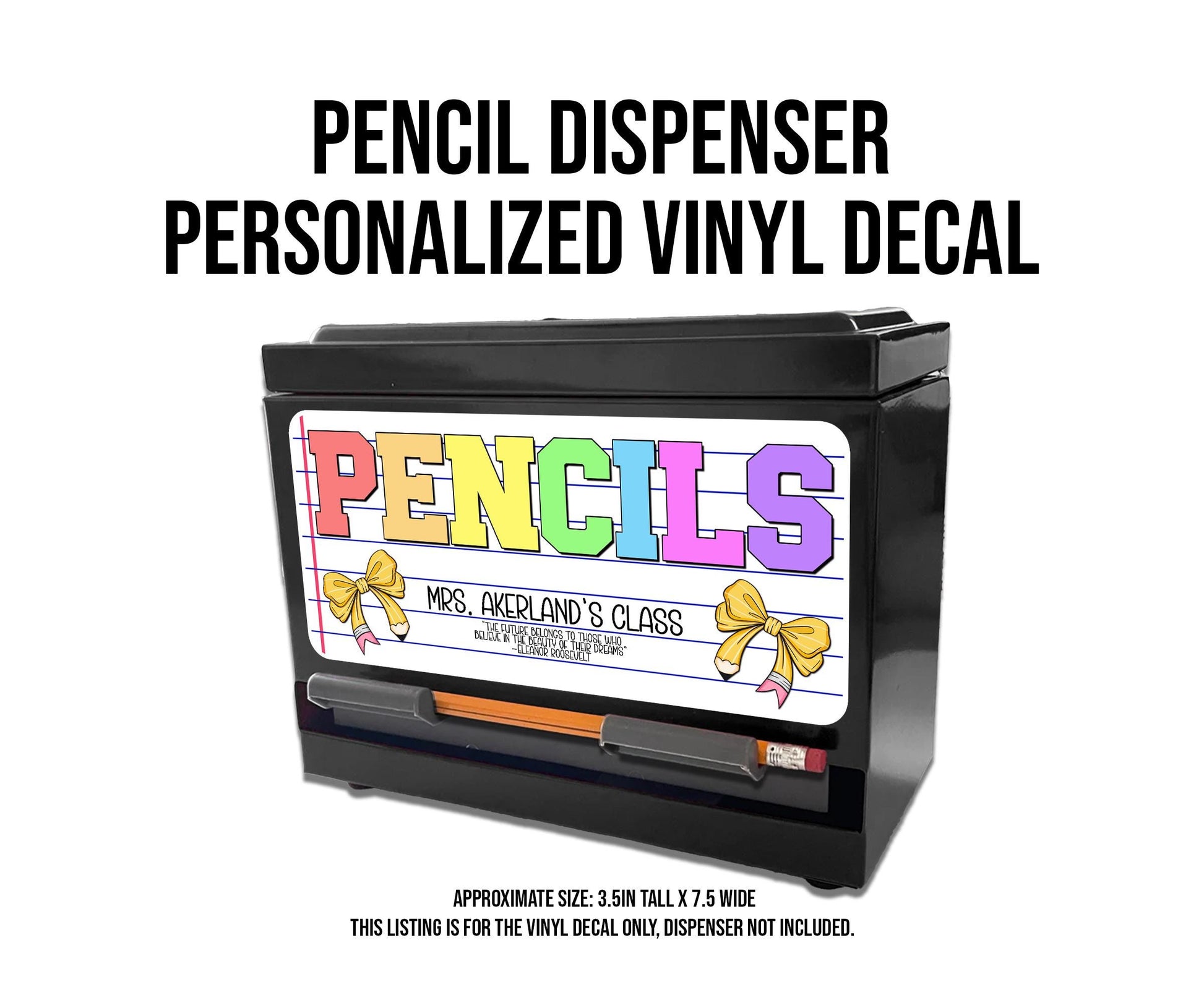 Personalized Vinyl Decal for Pencil Dispensers. Each decal will measure approximately 3.5 inches tall and 7.5 inches wide. Decal can be personalized with a name, room number etc. The word PENCILS can not be edited.
