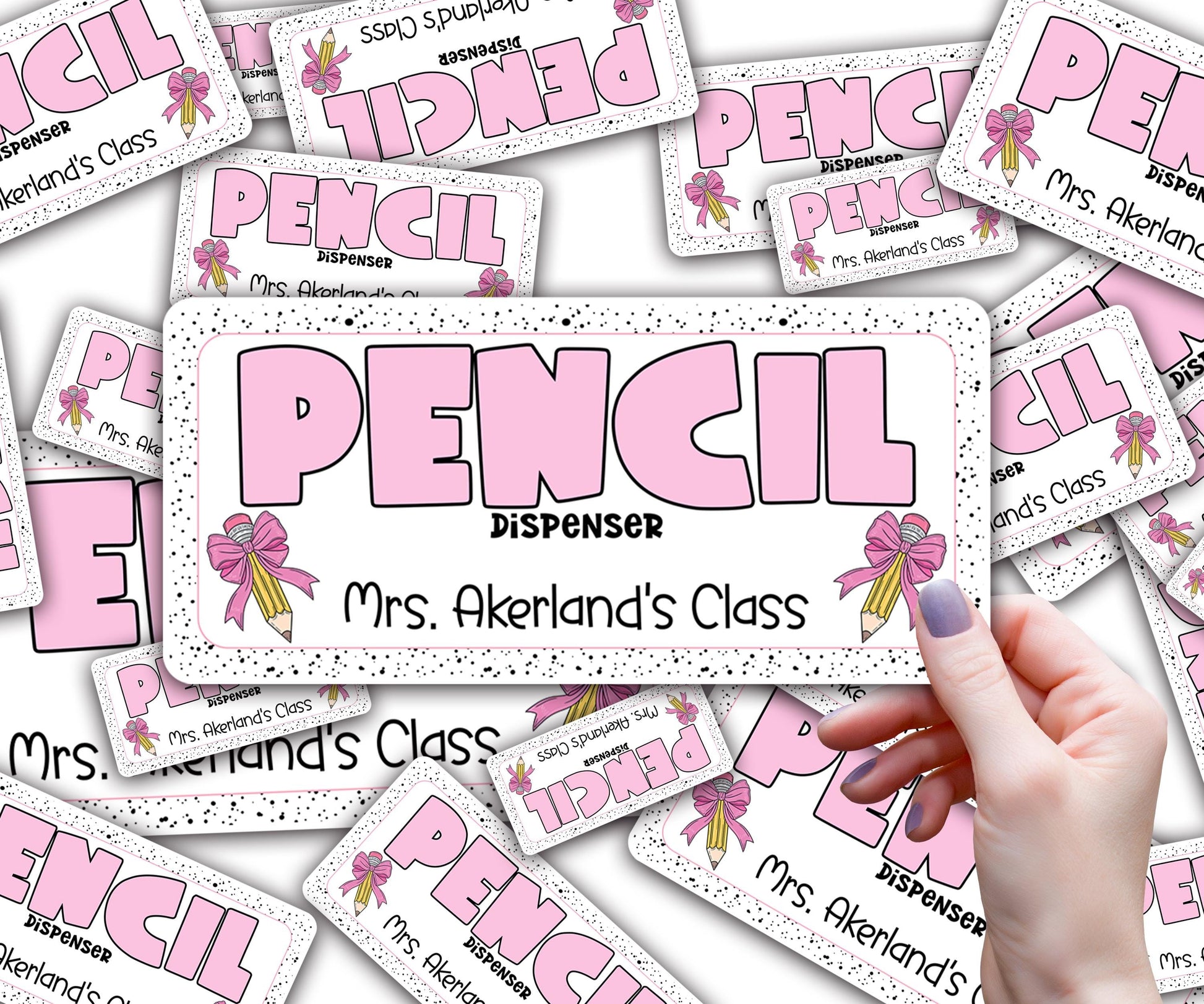 Custom Pencil Dispenser Waterproof Vinyl Decal OR Magnetic Decal Personalized with a name, Pink Pencil Bow Theme, Teacher Appreciation