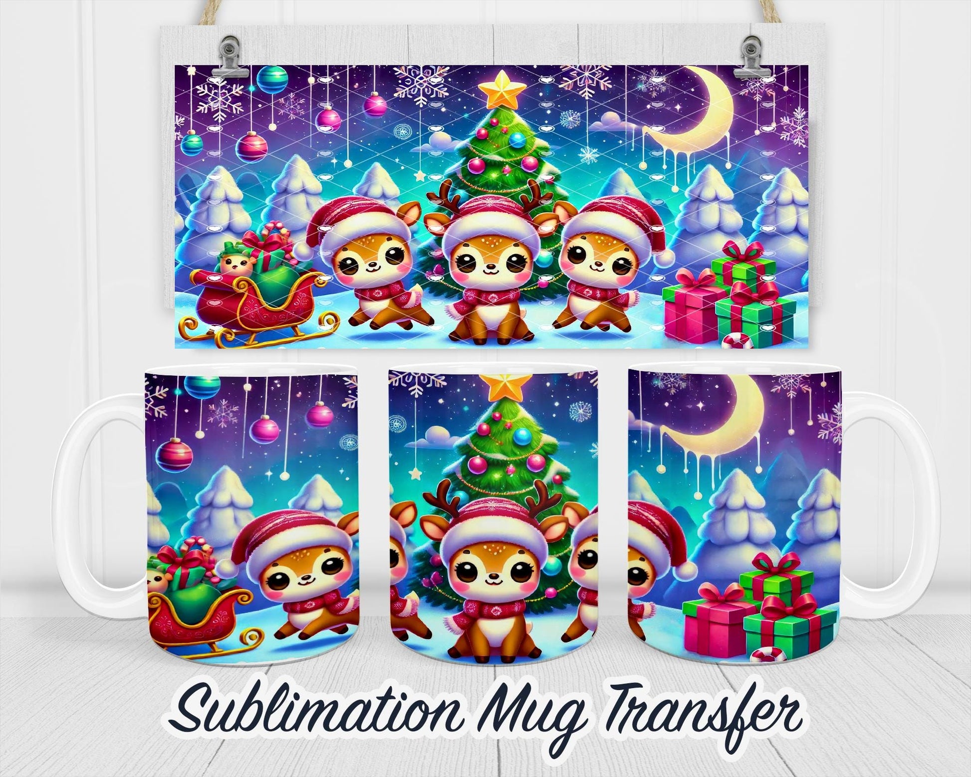 Reindeer Christmas Sublimation Mug Transfer Print For 11 oz - 15 oz Mugs - Ready To press Heat Transfer SHIPS NEXT DAY